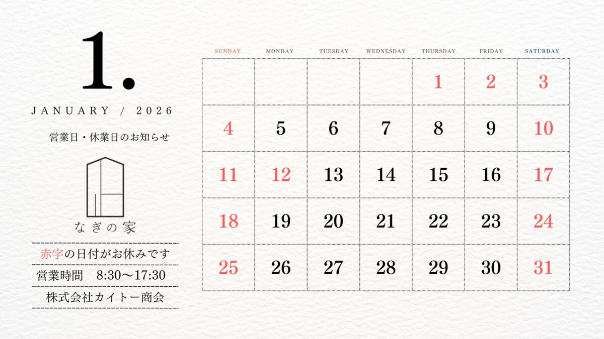 お知らせ お知らせ なぎの家 産業用太陽光 2025.12.23 お知らせ なぎの家 2026年1月の営業日・休業日のお知らせ 2026年1月の営業日につきましては、下記のカレンダーにてご確認をお願いいたします。 「なぎの家」についてのご相談は、平日事前予約にて土日祝日もご対応致します。